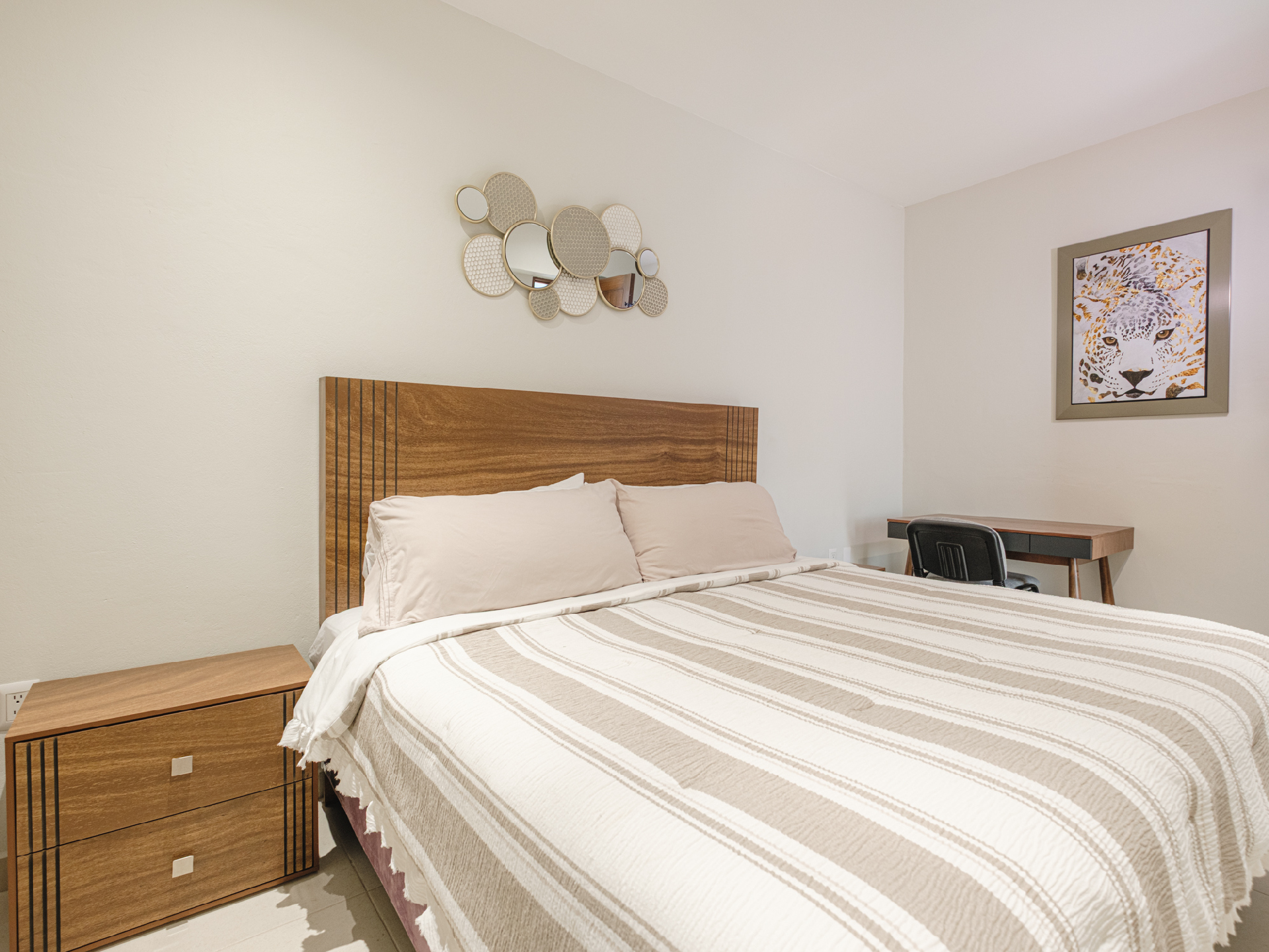 Confortable habitación de 18 m2, cuenta con 1 Cama King, con una ocupación máxima de hasta 2 personas adultas, área de trabajo con escritorio.