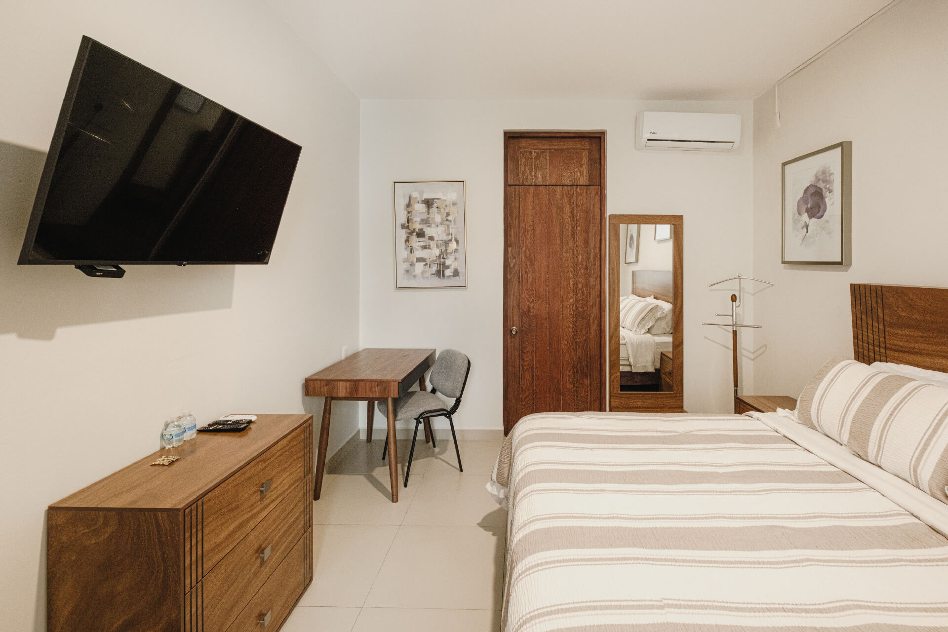 Confortable habitación de 18 m2, cuenta con 1 Cama King, con una ocupación máxima de hasta 2 personas adultas, área de trabajo con escritorio.