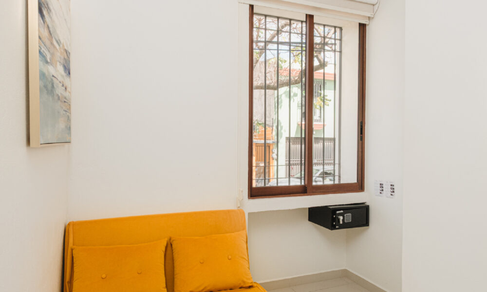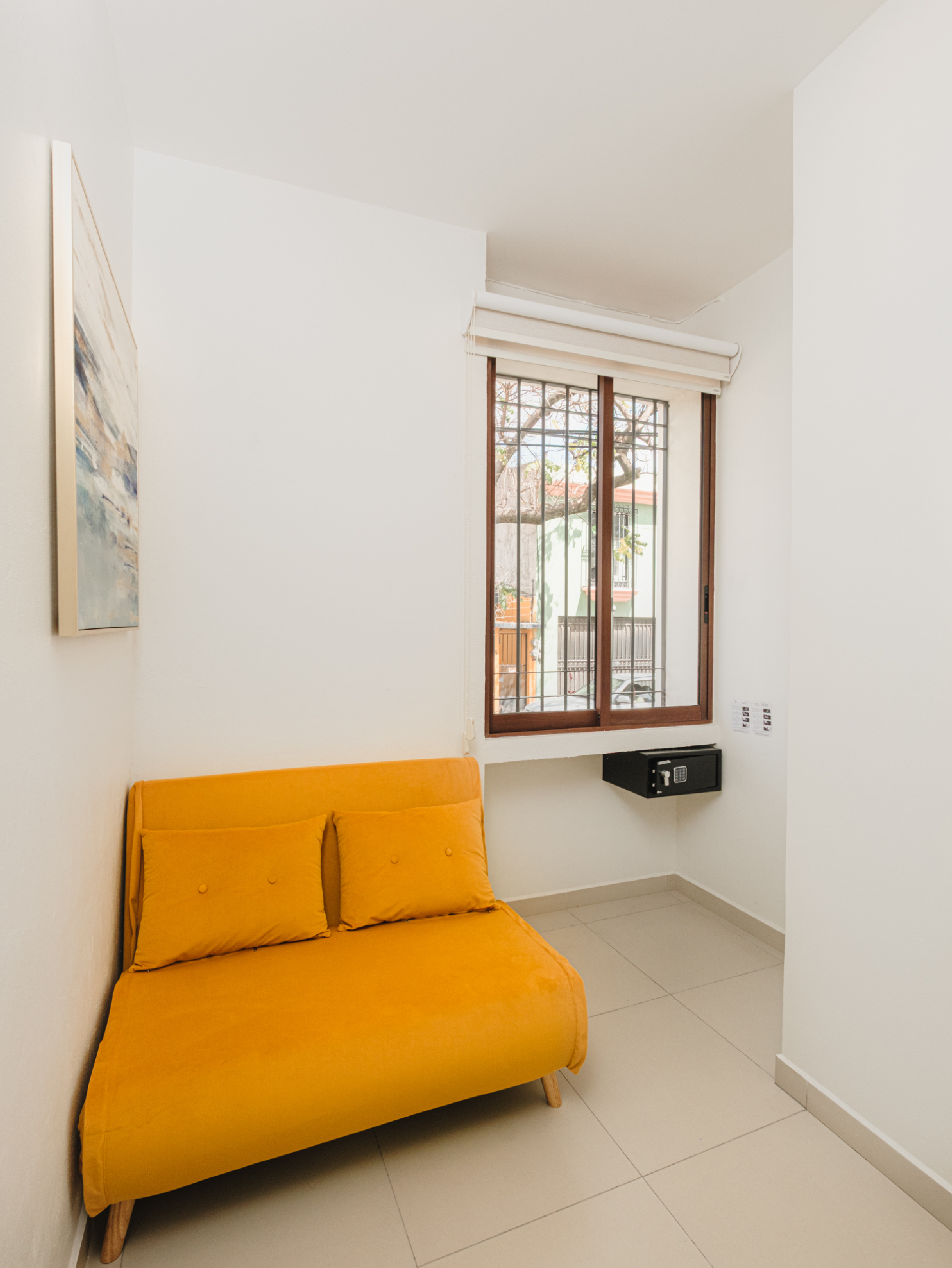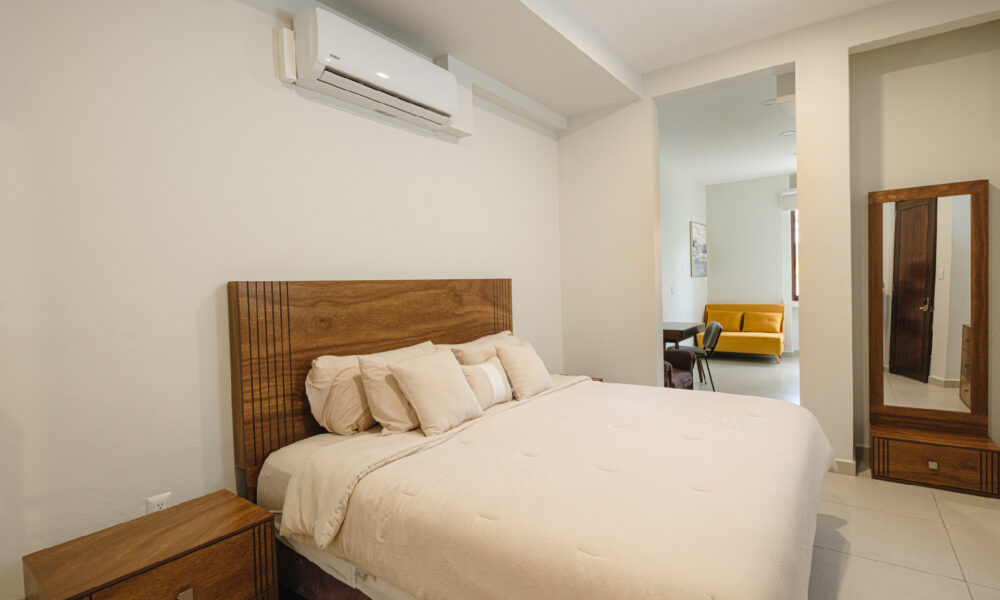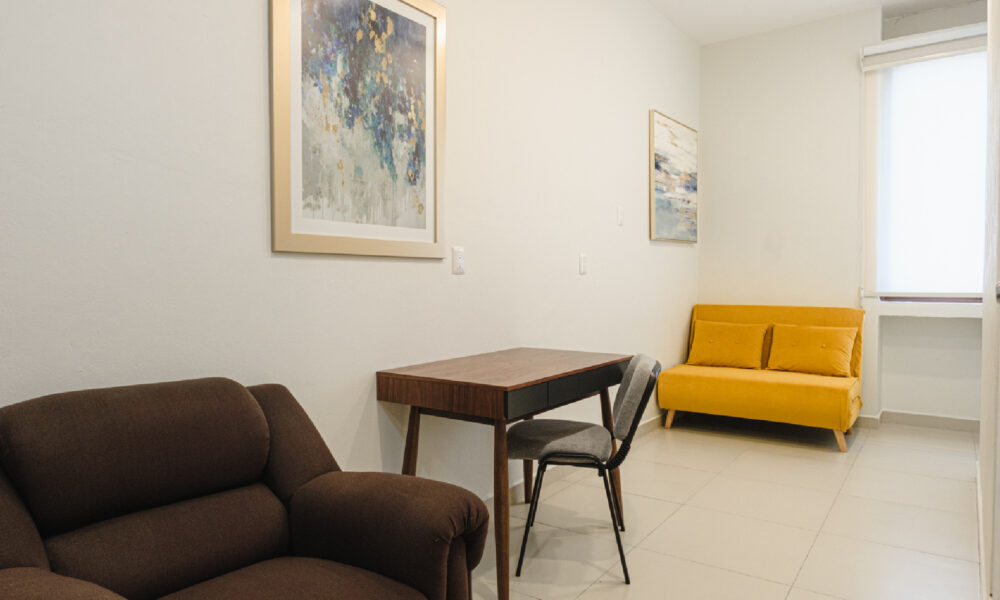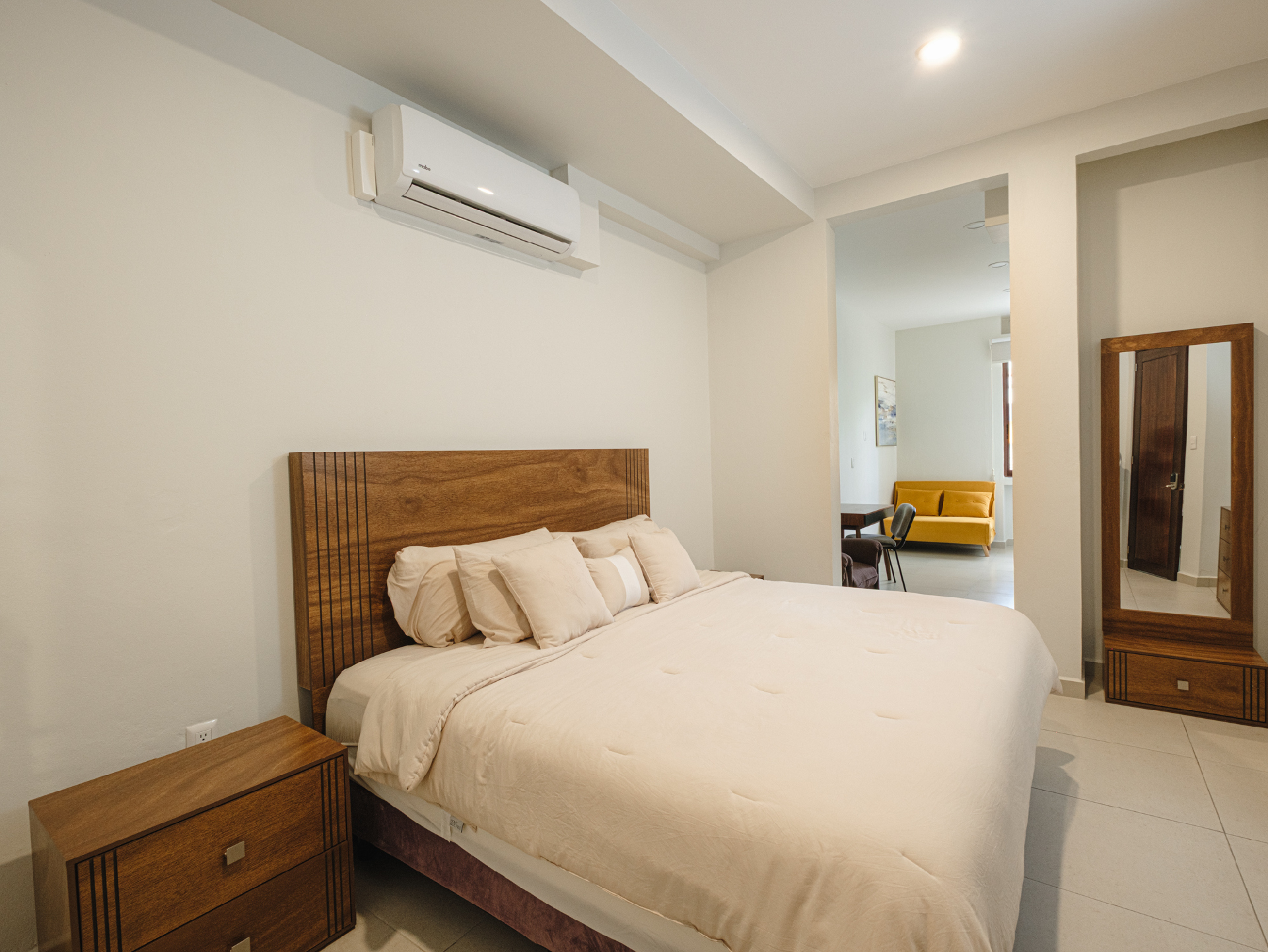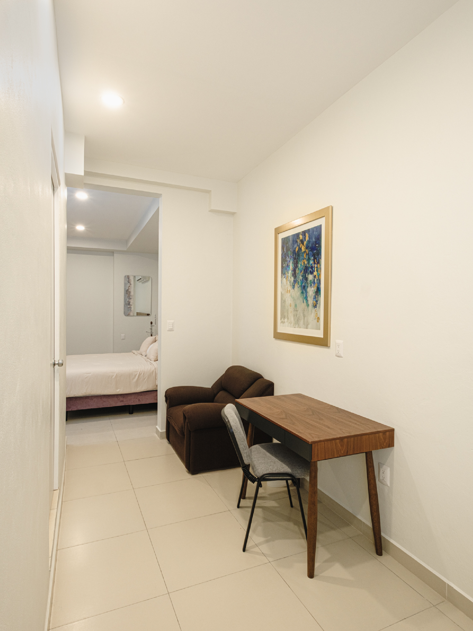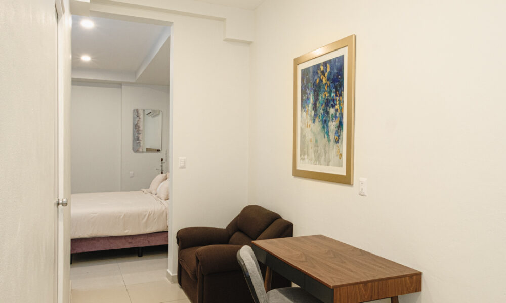 Confortable habitación de 29.13 m2, cuenta con una Cama King, un sofá cama, y área de trabajo con escritorio.